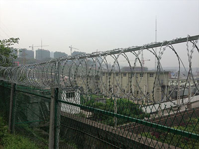 (3)刺絲滾籠由刺絲連接卡扣與固定在支架上的縱向拉筋相連接??v向拉筋與支架的連接采用Φ2.5mm的冷拔鍍鋅鋼絲繞2圈后擰緊固定。支架設(shè)置在跨度3m防護(hù)柵欄的立柱和跨中位置,其中跨度進(jìn)設(shè)置與立柱上部,支架與防護(hù)柵欄采用支架抱箍連接,對(duì)于已經(jīng)安裝金屬網(wǎng)片的防護(hù)柵欄。刺絲滾籠直接采用Φ2.5mm的冷拔鍍鋅鋼絲或刺絲連接卡扣固定于金屬網(wǎng)橫片和金屬絲上。