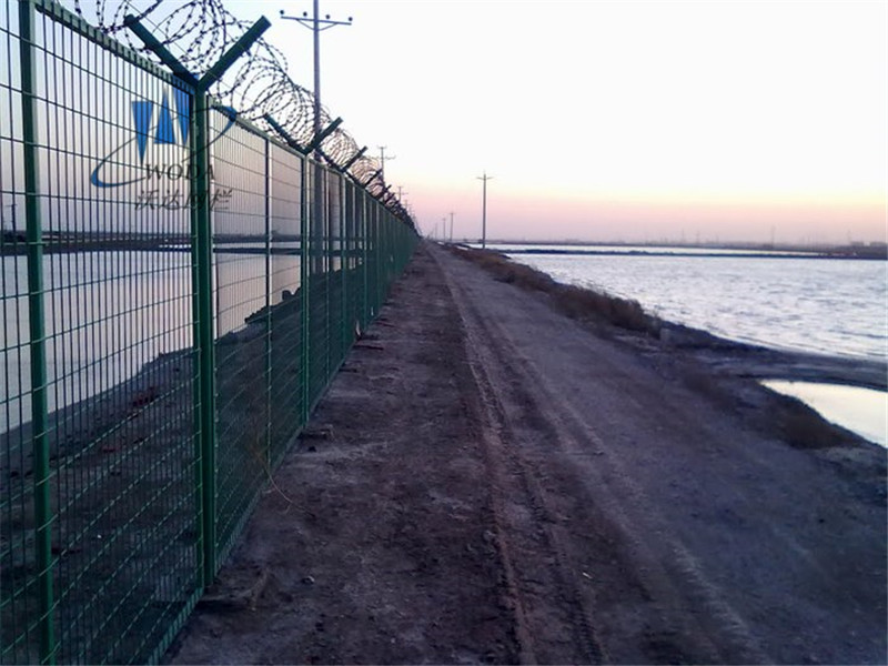隔離柵主要用V型支架立拄,加強型焊接片網,安全防盜連接件和熱鍍鋅刀片刺繩隔離柵組成強度和安全防御性級別很高。近年來,被廣泛應用在 ,軍事基地等高安全場所。注:如果在 隔離柵頂部加裝刀片刺絲,刀片刺繩后又很好的增強了安全防護性能。采用熱鍍,噴塑,電鍍,浸塑等防腐形式,具有很好的抗老化,抗曬,耐候等特點。