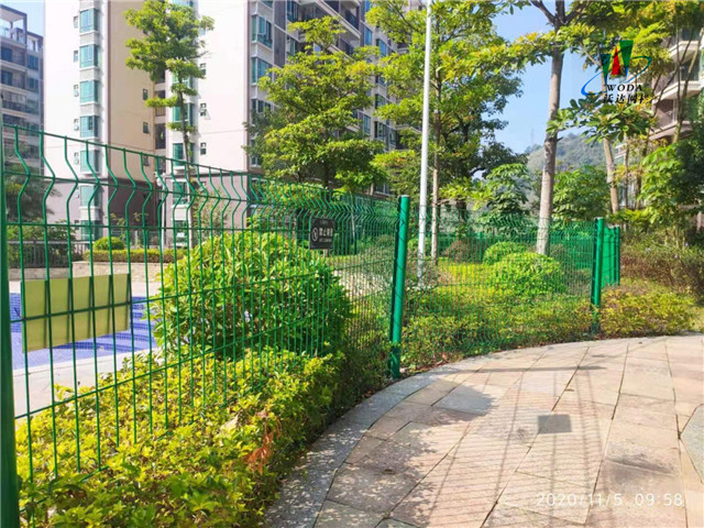 小區(qū)防護網(wǎng)是經(jīng)電焊網(wǎng)片機對鐵絲,焊接后,再經(jīng)折彎、噴塑或PVC等多道工序加工制作而成。具有耐腐蝕,美觀,并有效起到防護等特點。