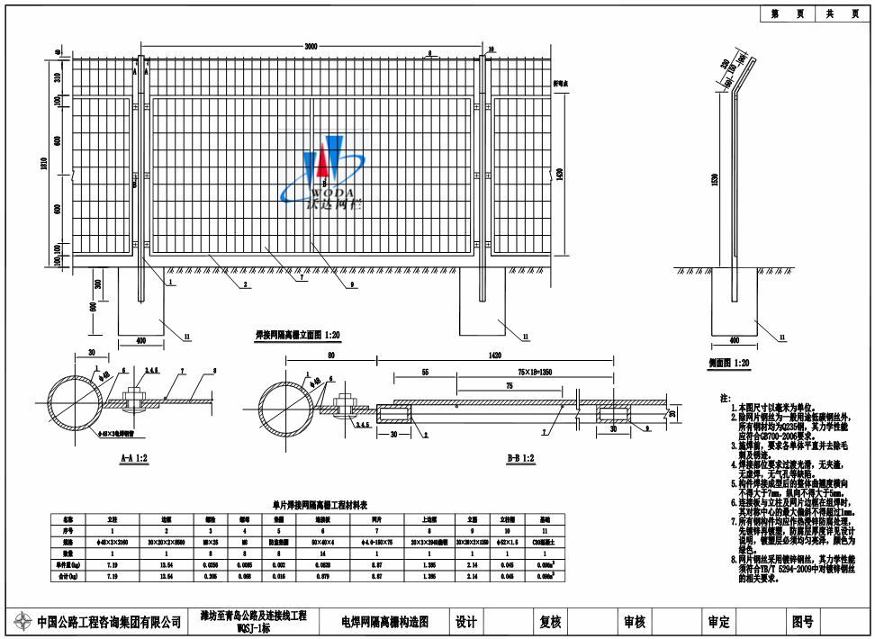 (3)除在天然屏障(河流等)以外,全線設(shè)置隔離柵。在互通立交、收費(fèi)站、服務(wù)區(qū)、停車區(qū)、城鎮(zhèn)附近等人口稠密區(qū)設(shè)置電焊網(wǎng)隔離柵,在人煙稀少的丘陵區(qū)等其他區(qū)域設(shè)置編織網(wǎng)隔離柵。
